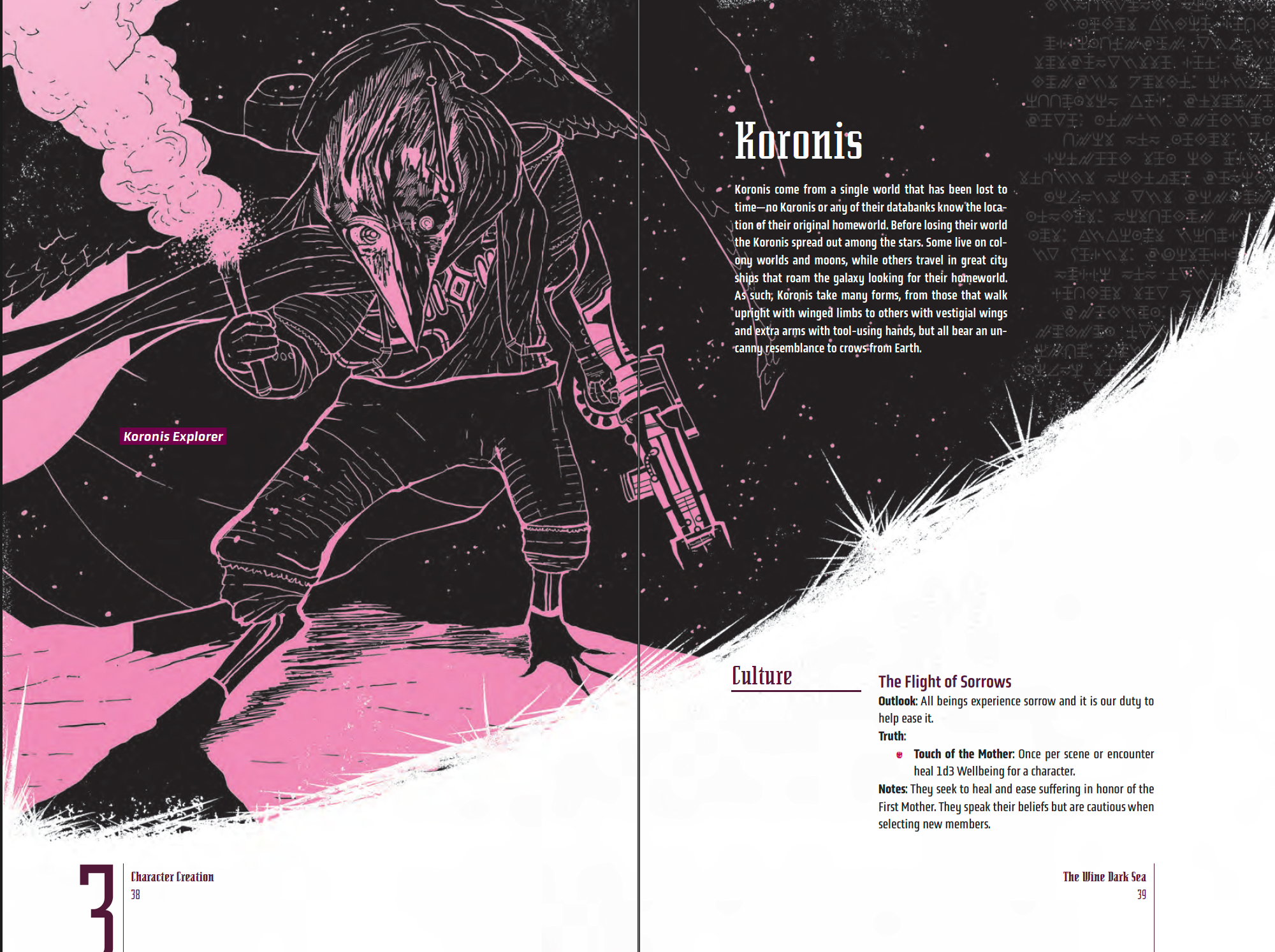 All manner of strange horrors lurk here amidst the crimson void, from shambling undead in forgotten holds of derelict ships, demon gods hailing from an ancient kilometers-long artifact known as the Gate, to countless other unnamed terrors. What toll will the Wine Dark demand of your character? How will your own horror manifest?